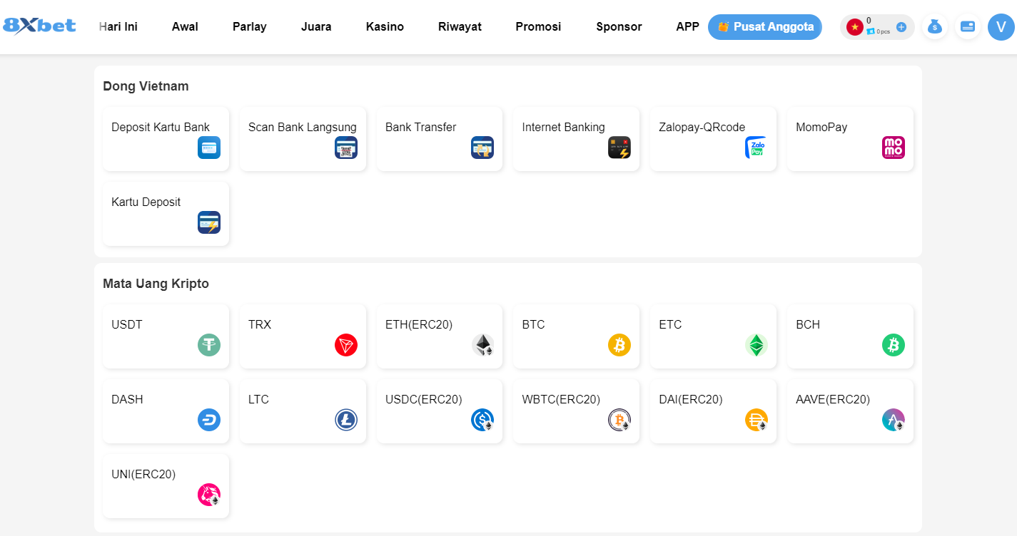 Setelah mendaftar, Anda harus masuk ke 8XBET dan menyetor uang untuk bertaruh pada permainan. Anda dapat melakukan deposit minimal 100k hanya dalam 5 menit.
